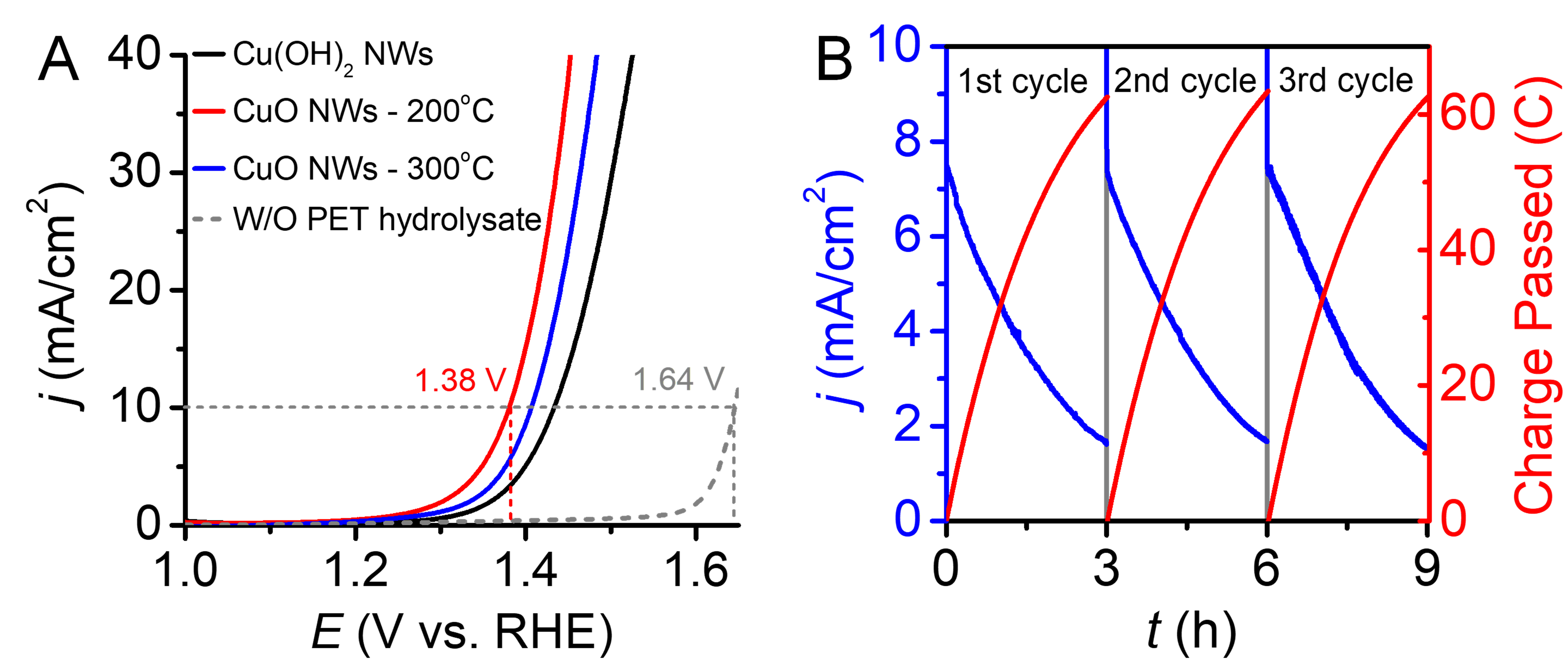 图2. (A) 不同铜基氧化物催化电极在PET水解液中的LSV曲线。(B) 在1.45 V 电位条件下,CuO NWs电极在PET水解液中的电解曲线图。