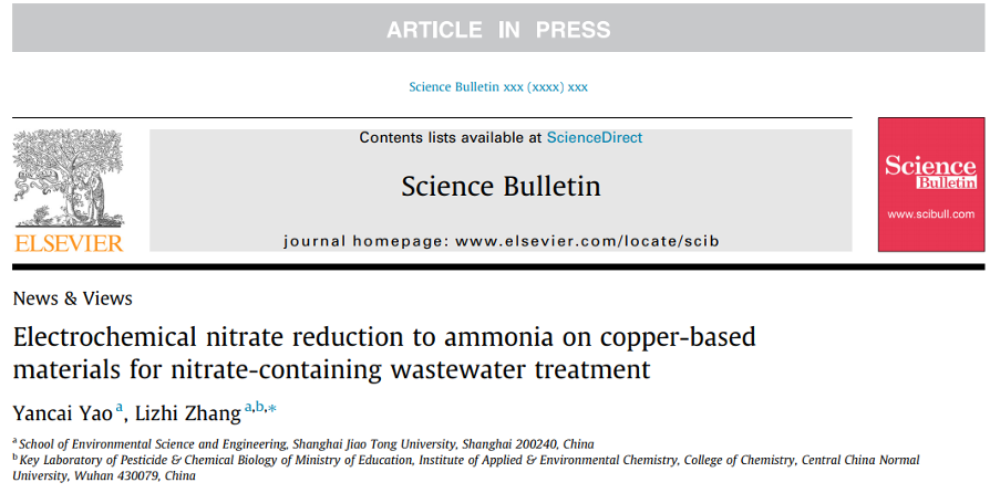 近期,香港AV 铁环境化学与污染控制研究团队(张礼知教授团队)在综合性Top期刊Science Bulletin发表了题为《Electrochemical nitrate reduction to ammonia on copper-based materials for nitrate-containing wastewater treatment》的视点文章,第一作者为么艳彩助理教授。