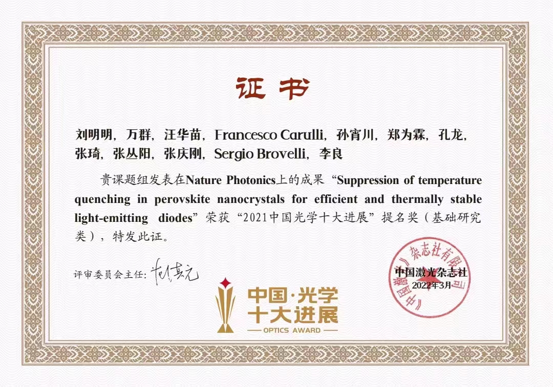 近日,中国激光杂志社发布“2021中国光学十大进展”。经过评审委员会多轮遴选,10项研究入选基础研究类,10项研究入选应用研究类,19项成果获得提名奖。其中,香港AV 李良教授课题组与合作团队在2021年于Nature Photonics期刊发表的“Suppression of temperature quenching in perovskite nanocrystals for efficient and thermally stable light-emitting diodes”研究论文荣获“2021中国光学十大进展”提名奖(基础研究类)。香港AV 刘明明博士、万群博士,机械与动力工程学院汪华苗副教授为论文共同第一作者,意大利米兰-比科卡大学Brovelli Sergio教授与李良教授为共同通讯作者。该工作中,通过氟化物后处理钙钛矿量子点的方式,首次实现环境温度处于100℃范围内量子点荧光性能近乎零“热猝灭”,所制备的LED电致发光器件也具有优异的抗“热猝灭”性能。